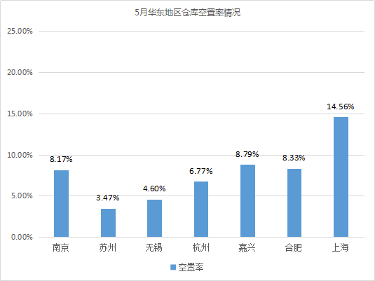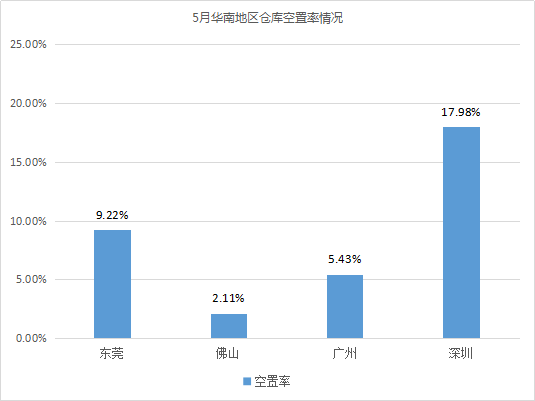 倉庫空置率最低的城市為佛山、蘇州,均低于3%。相較4月,兩個城市倉庫空置率波動不大,倉儲市場基本保持平穩。