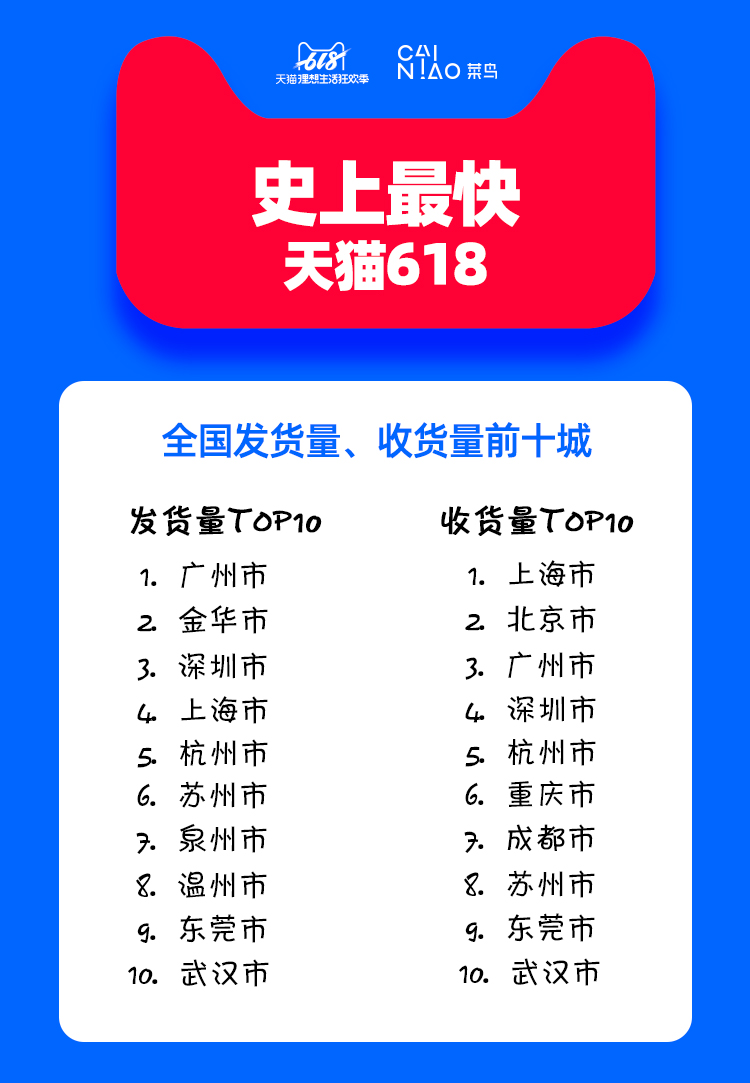 今年天貓618,產(chǎn)業(yè)帶集聚效應和大促爆發(fā)力日益顯現(xiàn),物流保障成為中流砥柱。菜鳥發(fā)布的數(shù)據(jù)顯示:天貓618期間,全國發(fā)貨量最大的前十城中,廣東和浙江占據(jù)六席,廣州、金華、深圳位列前三甲。收貨量最大的十大城市中,北上廣深杭穩(wěn)居前五,重慶、成都、蘇州、東莞、武漢躋身前十。