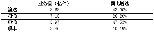 從業務量上看,在四家快遞公司中,韻達以8.68億票領跑,圓通、申通、順豐分別以7.18億票、5.97億票、3.46億票分列二到四位。