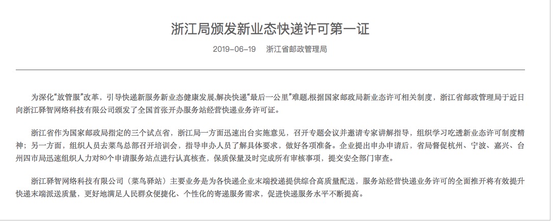 今年2月國家郵政局發布《國家郵政局辦公室關于企業開辦服務站經營快遞業務許可試點工作的通知》提到,為深化快遞領域“放管服”改革,引導快遞新服務新業態健康發展,對同一市(地)范圍內以開辦多個服務站的創新方式經營快遞業務的企業,要依法保護和規范其經營活動,并選取浙江省、福建省和山東省作為試點,對企業開辦服務站經營快遞業務實施許可。作為三個試點之一,浙江省對80個申請服務站點進行認真核查后,頒發了菜鳥驛站的首張開辦服務站經營快遞業務許可證。