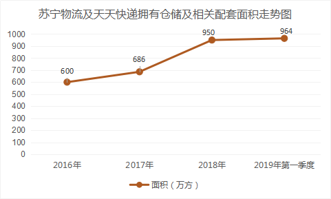 對于物流基礎(chǔ)設(shè)施的布局,從2016年其拿下天天快遞后,蘇寧物流倉儲布局在2018年進(jìn)展實現(xiàn)了大跨步。此外,2019年一季度,蘇寧物流倉儲面積達(dá)到964萬平方米,預(yù)計2020年底達(dá)到2000萬平方米,這是2017年的三倍之多,而換言之,接下來蘇寧物流要在一年半的時間倉儲規(guī)模提升一倍。