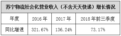 無論是從2018年極速增長的物流基礎(chǔ)設(shè)施,還是下沉創(chuàng)新的服務(wù)場景,拋開智慧零售,蘇寧物流無疑走在從企業(yè)物流到物流企業(yè)換道的關(guān)鍵階段。作為物流企業(yè),服務(wù)和盈利才是唯一的核心。據(jù)財報顯示,近年來,蘇寧物流社會化營業(yè)收入(不含天天快遞)一直呈現(xiàn)增長態(tài)勢。其中,2016年大幅度增長或與2015年社會化業(yè)務(wù)基礎(chǔ)相對少有關(guān)。