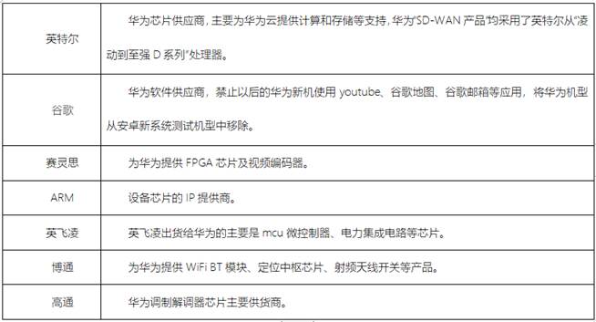 時下,圍繞制造業供應鏈領域最為熱議的莫過關于“貿易戰”與“華為”的話題。美國將家具和汽車零部件等一系列價值2000億美元的中國商品的關稅提高到25%。隨后,作為回應,中國提出對價值600億美元的美國商品征收關稅。緊接著美國威脅要對所有剩余的價值約3000億美元的中國出口產品征稅,實體制造業被推到風口浪尖。從美國商務部將華為列入“實體清單”之后,已經有多個國際巨頭中斷了與華為的業務往來,包括半導體企業高通、博通、英偉達、英特爾、AMD、美光、聯發科,在軟件上微軟和谷歌對華為也做出了限制,幾家企業在華為供應鏈上的職能如下: