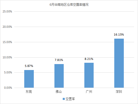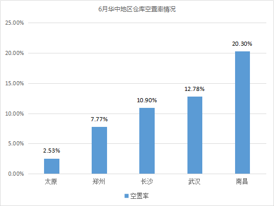 倉庫空置率最高的城市為重慶、南昌,均超過20%。相較5月,重慶倉庫空置率波動不大;南昌由于有部分高標庫投入市場,如江西中江國際物流(約9萬㎡)、南昌眾澤物流(1.2萬㎡)、蘇寧物流基地倉庫(超5萬㎡)等,導致倉庫空置率有所上漲,漲幅為7.05%。