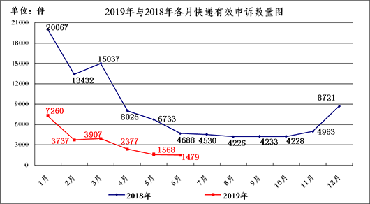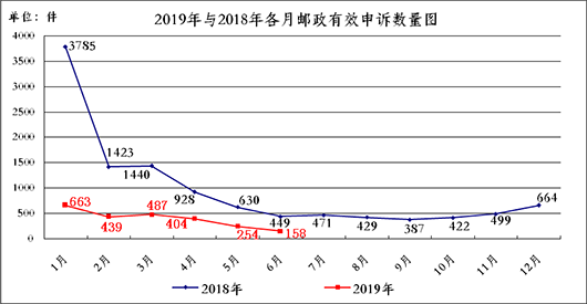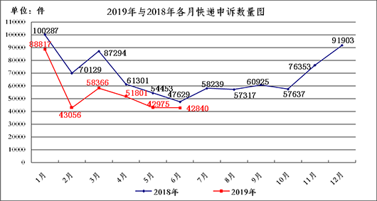 2019年6月,國家郵政局和各?。▍^(qū)、市)郵政管理局通過“12305”郵政行業(yè)消費者申訴電話和申訴網站共處理消費者申訴44844件。申訴中涉及郵政服務問題的2004件,占總申訴量的4.5%;涉及快遞服務問題的42840件,占總申訴量的95.5%。