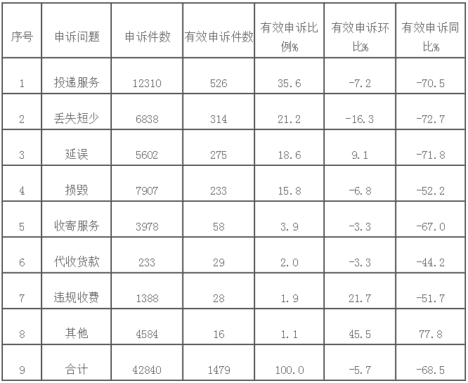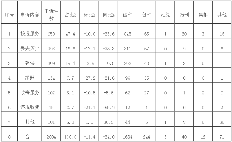 郵政業(yè)消費者對郵政服務申訴的主要問題是投遞服務、郵件丟失短少和郵件延誤,分別占申訴總量的47.4%、19.6%和15.4%。郵政服務問題申訴量環(huán)比、同比均呈下降趨勢。