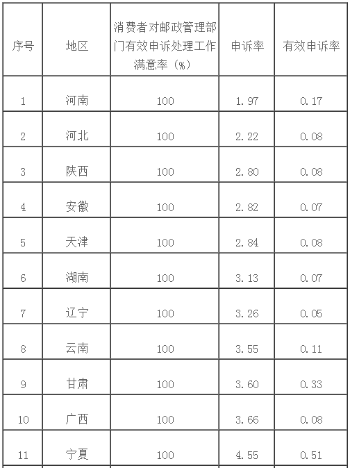 郵政業(yè)消費者對各省(區(qū)、市)郵政管理部門有效申訴處理工作滿意率平均為98.2%,高于全國平均數的地區(qū)有22個,低于全國平均數的地區(qū)有9個;各?。▍^(qū)、市)快遞服務申訴率平均為3.99,低于全國平均數的地區(qū)有16個,高于全國平均申訴率的地區(qū)有15個;各?。▍^(qū)、市)快遞服務有效申訴率平均為0.14,低于全國平均數的地區(qū)有17個,高于全國平均數的地區(qū)有14個。