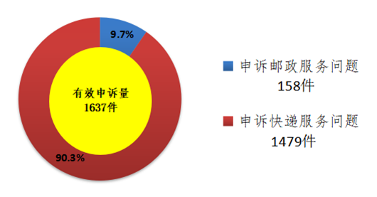處理的申訴中,有效申訴量(確定企業(yè)責任的)為1637件,比上年同期下降68.1%。有效申訴量中涉及郵政服務問題的158件,占有效申訴量的9.7%;涉及快遞服務問題的1479件,占有效申訴量的90.3%。