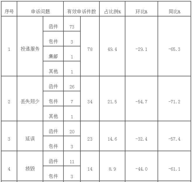 郵政業(yè)消費者對郵政服務問題有效申訴158件,環(huán)比下降37.8%,同比下降64.8%。
