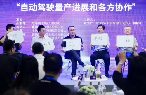 (從左至右:四維圖新自動駕駛AI總監(jiān)李陽、速騰聚創(chuàng)聯(lián)合創(chuàng)始人兼COO 邱純潮、地平線創(chuàng)始人兼CEO 余凱博士、中國重汽智能網(wǎng)聯(lián)負(fù)責(zé)人 田磊、嬴徹科技創(chuàng)始人兼CEO 馬喆人)