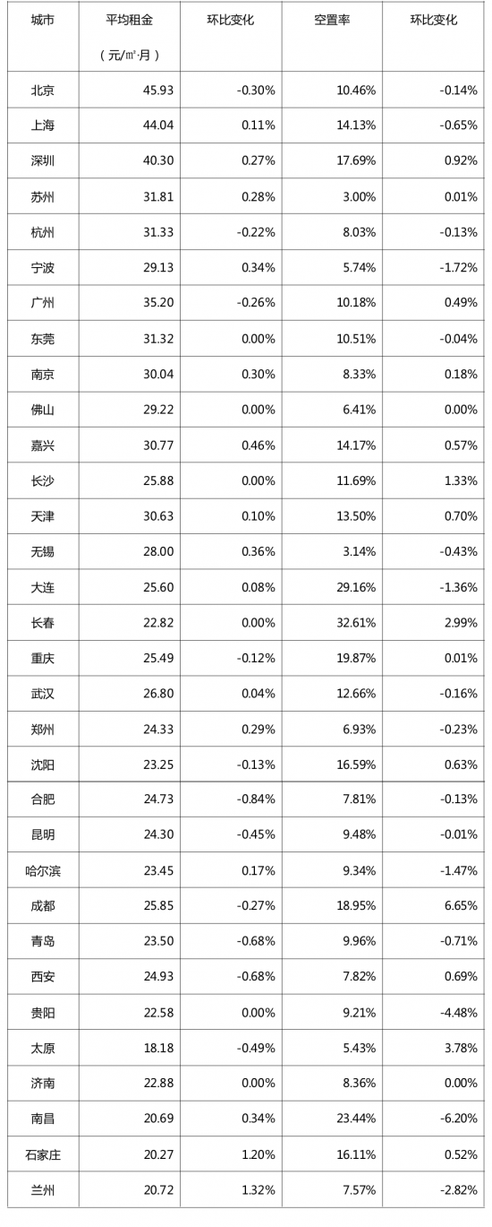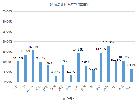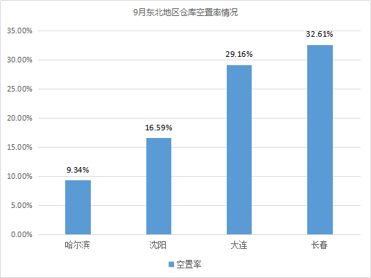 倉庫空置率最高的城市為長春、大連,平均在30%左右。相較8月,長春延續上月倉庫空置率上升趨勢,空置率升幅約2.99%;大連因2019年“雙11”電商節臨近,快遞快運企業業務流量增加,臨時擴倉需求加大,導致倉庫空置率有小幅下降,降幅為1.36%。