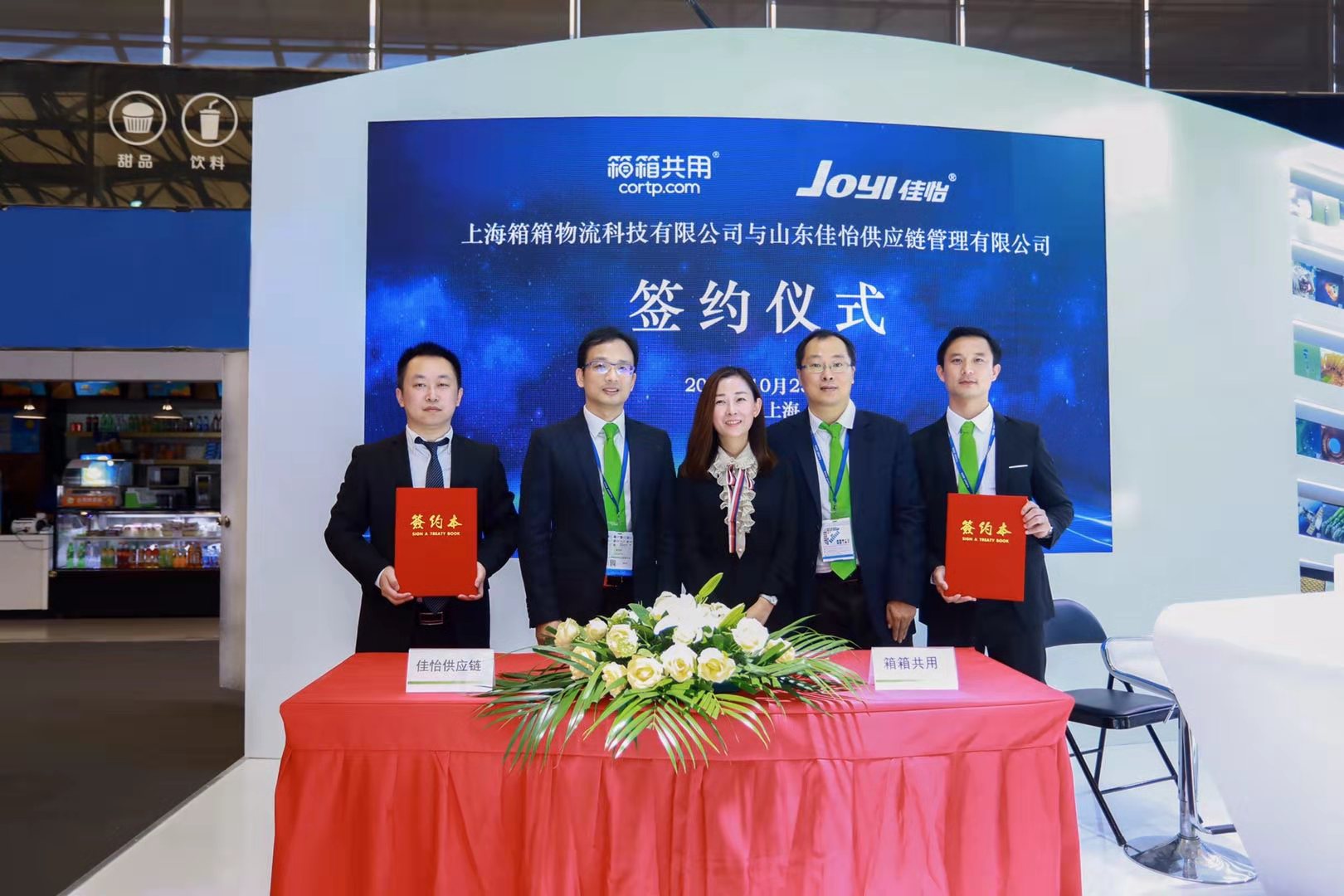 山東佳怡供應(yīng)鏈管理有限公司總經(jīng)理賀小軒與箱箱共用集團(tuán)副總裁王金成現(xiàn)場簽約