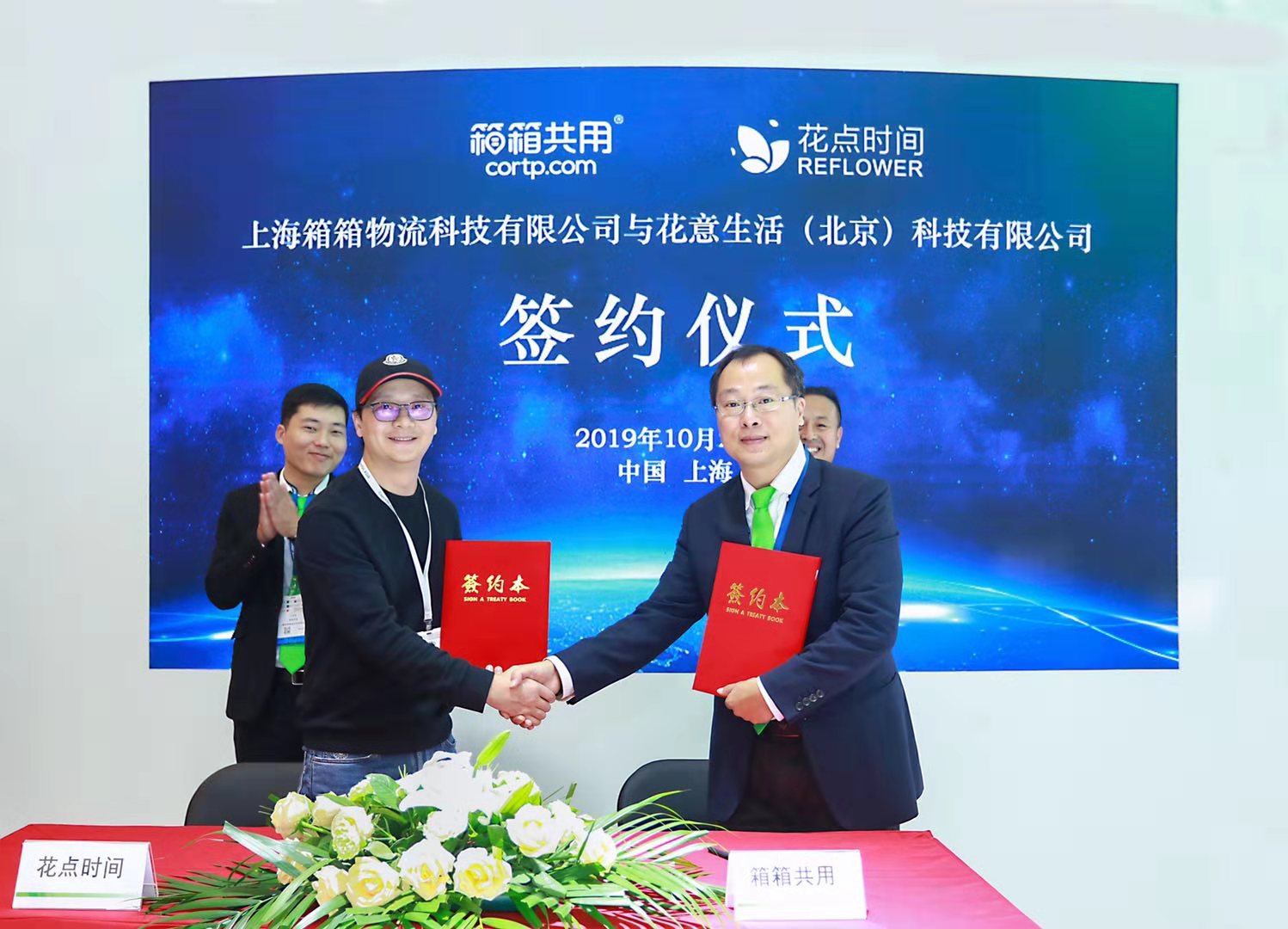 花點時間物流副總裁兼華東區(qū)總經(jīng)理衡李澤與箱箱共用集團(tuán)副總裁王金成現(xiàn)場簽約