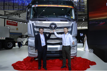 【福田汽車品牌副總裁、福田戴姆勒汽車品牌戰略總監李健與福田戴姆勒汽車營銷公司鄂贛分公司總經理程志堅共同揭幕歐曼超級重卡國典版】
