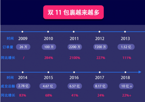 除了價格的狂歡,這些電商大促節日在短期內帶來了訂單與貨量的暴增,毫無疑問,這也是一場考驗物流效率和服務能力的戰役。以天貓雙11為例,2018年的包裹量高達13.4億,據國家統計局數據顯示,預計2019年雙十一期間產生的快遞包裹量有望突破22.5億件。從最初的幾何式井噴增長到如今的穩定上升,電商領域對物流服務商在配送速度與服務質量上的高要求從未停止,隨時迎接大貨量成為了物流人的常態,“分鐘級物流”已是電商物流發展大趨勢的關鍵詞之一。