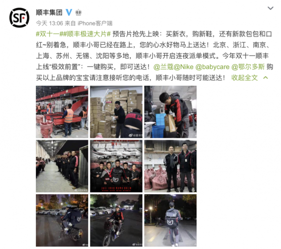 雙十一物流高峰不可避免,但很多品牌依然需要持續(xù)保持優(yōu)質的物流服務,保障客戶體驗。對此,順豐推出“極效前置”產品,通過強大的大數據預測能力,以及覆蓋全國的服務網絡,提前將商品放置到離消費者最近的場所。當用戶在雙十一零點過后支付完尾款,順豐小哥就能以最快的速度將商品送到家門口。