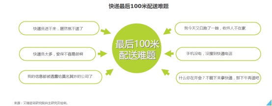 在艾瑞咨詢發布的《中國智能快遞柜行業案例研究2018》報告中,直接將配送環節細化到最后100米,給出了最后100米末端配送的主要難題:人難找、門難進、送件慢、收件難。即便智能快遞柜大量進場,也無法解決用戶需要配送上門的需求。
