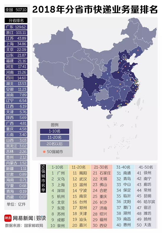 不過根據網上數據顯示,到2018年,廣東省累計快遞業務量高達129.6億件,位居榜首!(江浙滬地區的要加油啊~)