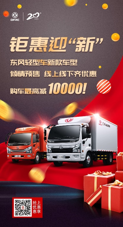 而今年雙十一網購狂歡,東風輕型車同步參與。在11月11日0時啟動了新款車型預售,線上線下同步促銷,購車最高可享受10000元優惠。登錄“東風汽車惠享平臺”APP即可一鍵領取無門檻5000元新車購車券;通過惠購平臺購買新款車型,可獲得微信1000元現金紅包。