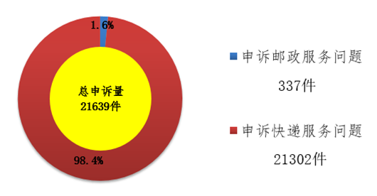 2019年10月,國家郵政局和各省(區、市)郵政管理局通過“12305”郵政行業消費者申訴電話和申訴網站共處理消費者申訴21639件。申訴中涉及郵政服務問題的337件,占總申訴量的1.6%;涉及快遞服務問題的21302件,占總申訴量的98.4%。