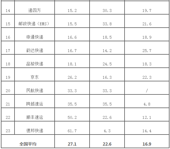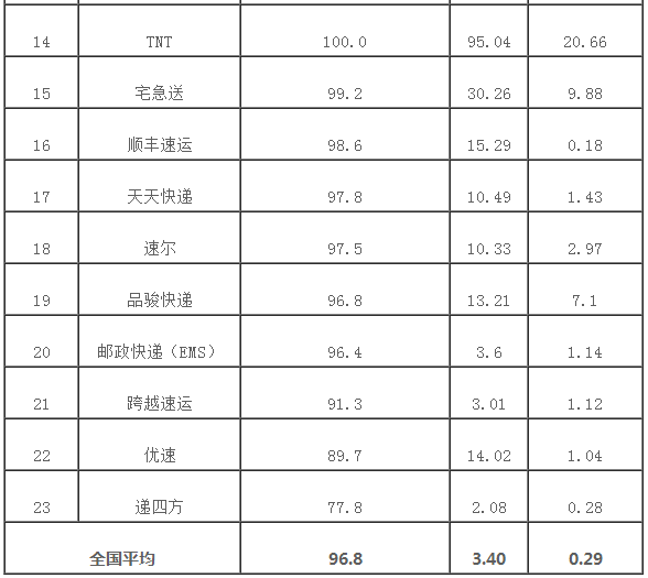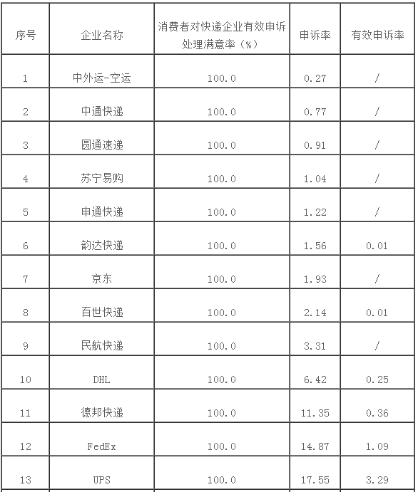 10月,郵政業消費者對全國快遞企業有效申訴處理滿意率平均為96.8%,高于全國平均數的快遞企業有19家,低于全國平均數的有4家;全國快遞服務申訴率平均為3.40,低于全國平均數的快遞企業有11家,高于全國平均數的有12家;全國快遞服務有效申訴率平均為0.29,低于全國平均數的快遞企業有12家,高于全國平均數的有11家。