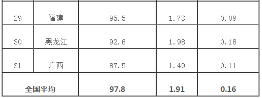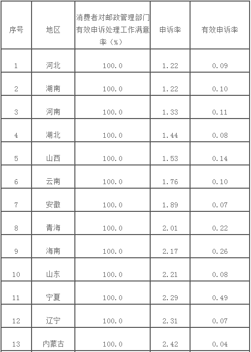 郵政業消費者對各省(區、市)郵政管理部門有效申訴處理工作滿意率平均為97.8%,高于全國平均數的地區有19個,低于全國平均數的地區有12個;各省(區、市)快遞服務申訴率平均為1.91,低于全國平均數的地區有13個,高于全國平均申訴率的有18個;各省(區、市)快遞服務有效申訴率平均為0.16,低于全國平均數的地區有17個,高于全國平均數的有14個。