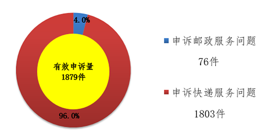 處理的申訴中有效申訴(確定企業責任的)為1879件,同比下降59.6%。有效申訴中涉及郵政服務問題的76件,占有效申訴量的4.0%;涉及快遞服務問題的1803件,占有效申訴量的96.0%。