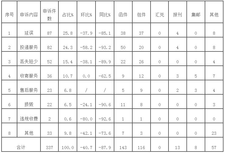 10月,郵政業消費者對郵政服務問題申訴337件,環比下降40.7%,同比下降87.9%。