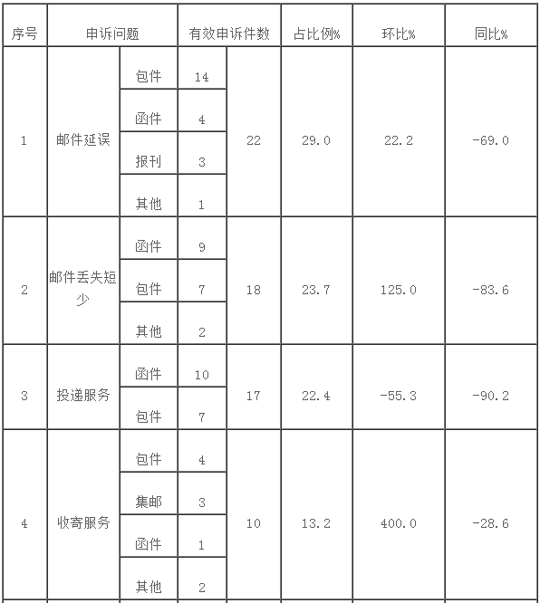 郵政業消費者對郵政服務有效申訴的主要問題是郵件延誤、郵件丟失短少和投遞服務,分別占有效申訴總量的29.0%、23.7%和22.4%。郵政服務問題有效申訴量環比增長明顯的是收寄服務和郵件丟失短少,同比均呈下降趨勢。