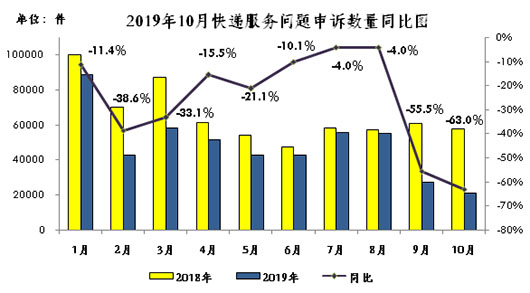 10月,消費者對快遞服務問題申訴21302件,環比下降21.4%,同比下降63.0%。