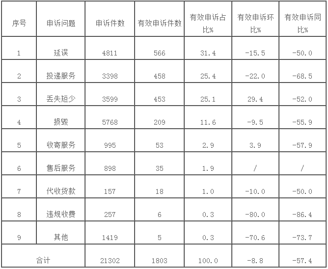 郵政業消費者對快遞服務有效申訴的主要問題是快件延誤、投遞服務和快件丟失短少,分別占有效申訴總量的31.4%、25.4%和25.1%。快遞服務問題有效申訴量環比增長明顯的是快件丟失短少問題,同比均呈下降趨勢。