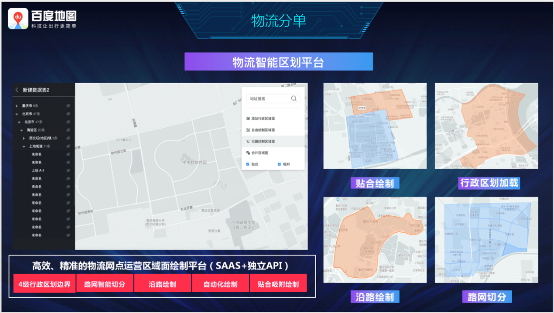 百度地圖智能物流引擎的地址標準化、地址解析聚合和物流智能區劃平臺,則可以有效提升訂單處理和“最后一公里”派送效率。地址標準化結合百度自然語言理解優勢,能從訂單文本中智能化提取信息,輸出姓名、電話、地址等內容。而地址解析聚合從空間和文本結構兩個維度,對物流包裹位置進行聚合,掛接到常見的派送末端,如小區、學校、寫字樓等,將業務場景從“人工”轉向“智能”,大幅提升末端效率和派送準確率,降低重復派送造成的成本浪費。智能區劃管理平臺采用智能繪制區域網點方式,集合路網切分、行政區劃加載、貼合繪制、沿路繪制等能力,與傳統繪制模式相比效率大幅提升,同時降低配送區域管理成本。