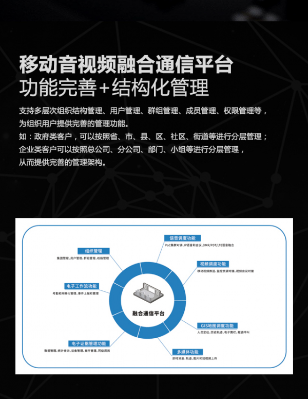 在終端之外,意云科技還提供功能完善、結構化管理的移動音視頻融合通信平臺。EV880執法記錄儀在實際應用中受控于指揮中心的融合通信平臺,平臺可隨時獲取其定位、巡邏軌跡、操作日志、考勤等信息,并可與一線終端實現遠程語音對講、實時圖傳或錄像、人員框選調度、信息下發等功能,輔助領導層進行快速決策和指令下達,真正做到運籌帷幄,決勝千里。