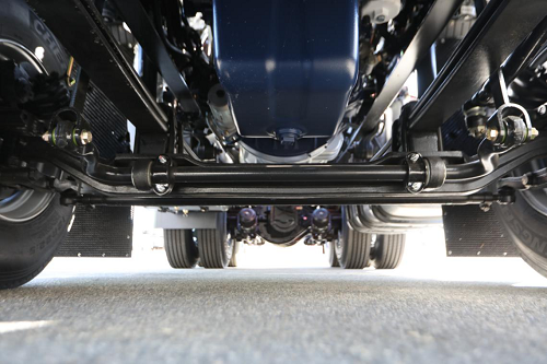 進(jìn)氣系統(tǒng)優(yōu)化為新式沙濾系統(tǒng),進(jìn)氣口為雙面進(jìn)氣、百葉窗結(jié)構(gòu),可有效防止渣土場(chǎng)清洗進(jìn)水。為適應(yīng)重載工況,在原車基礎(chǔ)上前板簧剛度提高16.6%,后板簧剛度提高21.4%,懸架可靠性進(jìn)一步提升。