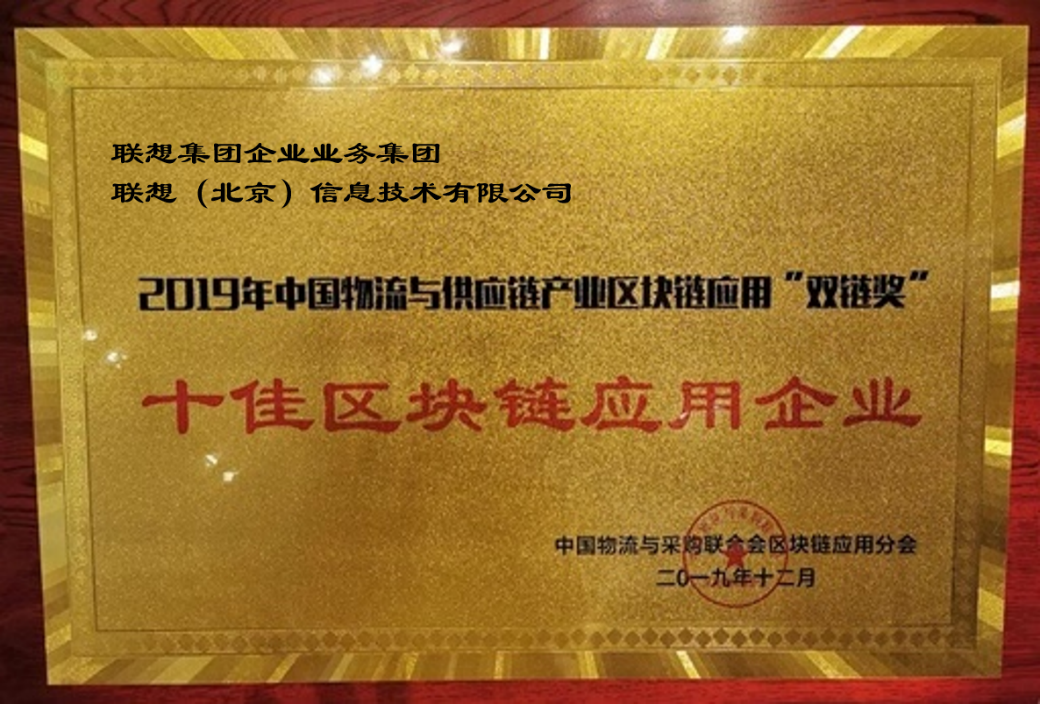 2019年12月3日,首屆全球供應鏈數字經濟峰會暨2019中國物流與供應鏈產業區塊鏈應用年會在深圳召開。會上頒發了2019中國物流與供應鏈產業“雙鏈獎”,聯想企業業務集團、中國建設銀行股份有限公司、京東物流等公司一同獲評最高獎項“十佳區塊鏈應用企業”。其中,聯想企業業務集團是唯一一家致力于供應鏈協同領域并進行應用實踐的企業。