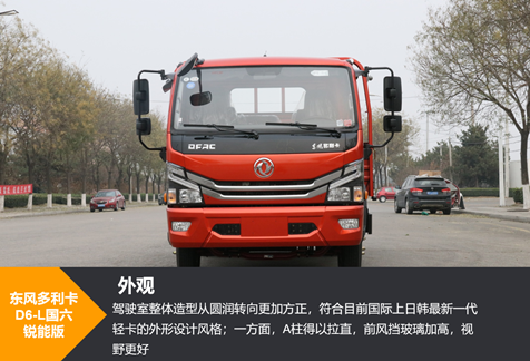 多利卡D6銳能版采用全新平臺(tái)設(shè)計(jì),除前臉繼承了家族式造型外,A柱拉直10°,頂蓋加高加寬70mm,前風(fēng)窗和門洞線加高100mm;還可加裝流線形“王冠”造型導(dǎo)流罩,美觀的同時(shí),有效地減小了車輛高速行駛時(shí)的空氣阻力,從而降低燃油消耗;“DFAC”和“東風(fēng)多利卡”的標(biāo)識(shí)也從老平臺(tái)的漆面挪到風(fēng)擋玻璃下方黑色區(qū)域,更加明顯,極具識(shí)別度。