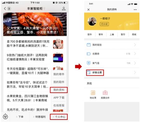 在“保管設(shè)置”中,可根據(jù)具體需求進(jìn)行個性化定制:用戶可以選擇同意豐巢代保管包裹,也可以選擇某個時段或者某家快遞公司的包裹不入柜,更加人性化。設(shè)置方式:打開“豐巢智能柜”公眾號,進(jìn)入個人中心-我的資料-保管設(shè)置,根據(jù)需求進(jìn)行設(shè)置。