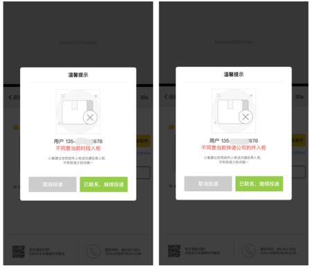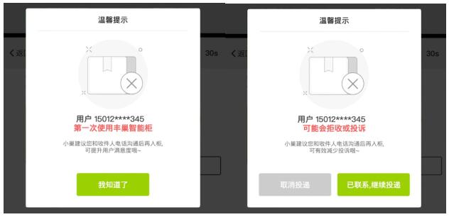 如果用戶設(shè)置了同意,那么安心使用豐巢代收、保管服務(wù)即可,如果設(shè)置了某些時段或者快遞快遞公司不同意入柜,那么快遞員在下次派件時會彈出提示,必須先聯(lián)系收件人:
