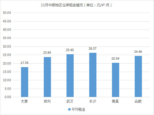 受倉儲設施條件、地理位置等影響,太原、石家莊倉庫租金水平仍較低,均低于20元/㎡·月。相較10月,太原、石家莊倉儲市場相對穩定,倉庫租金保持平穩。本月石家莊中儲集團約有4萬㎡倉庫項目建成交付。