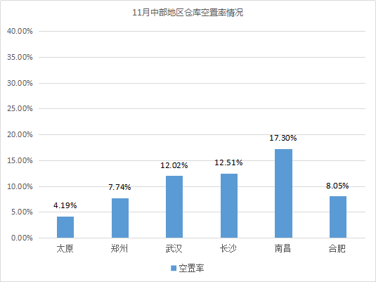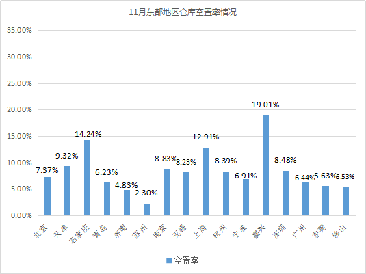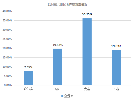全國32個城市倉庫平均空置率為10.85%,環比上漲0.65%。其中,東北地區倉庫空置率(20.68%)遠高于西部(11.35%)、中部(10.30%)、東部(8.41%)地區。相較10月,東北、中部地區倉庫空置率有小幅上漲,漲幅分別為2.10%(東北地區)、1.90%(中部地區);西部、東部地區倉庫空置率波動不大,增(降)幅在±1%以內。