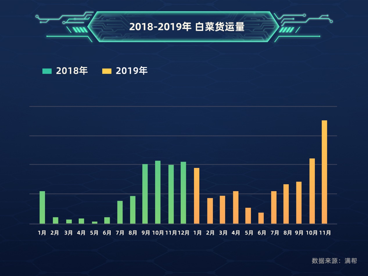 歷年來,白菜供應旺季都是9月到次年1月,而2019年9月,大白菜貨運量不及往年,較2018年下降了19.6%,10月貨運量追平2018年,而11月,山東、湖北、河南白菜集中上市,供應量大增,貨運量同比上漲85%,市場供應飽和,白菜價格應聲下跌。