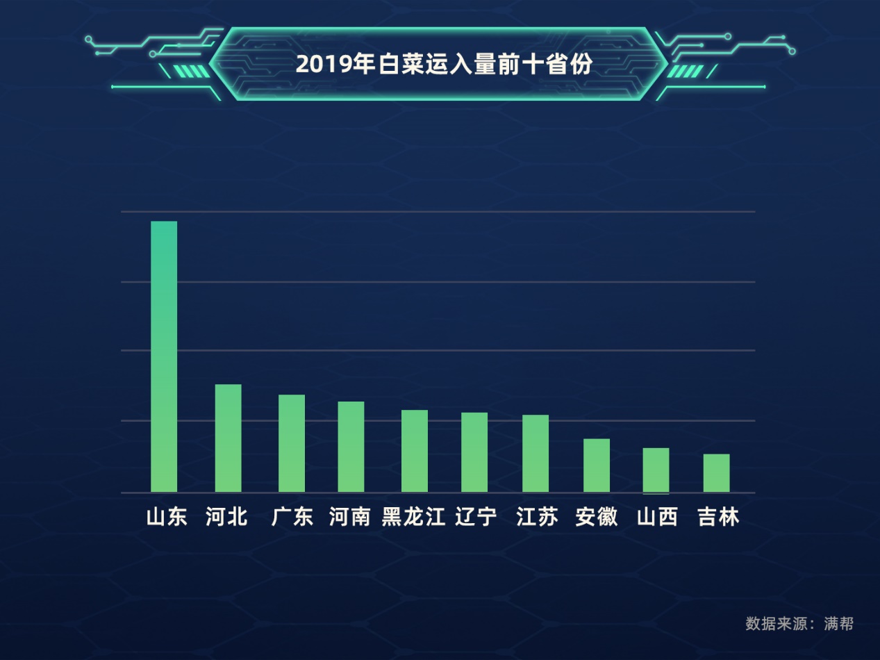 白菜主要輸出區域以北方為主,山東、河北、吉林、湖北、河南都是白菜輸出大省,其中,山東是絕對的主力。2019年,山東白菜輸出量占到了全國總量的四分之一,輸出量占比同比上漲了11%,同時,河北白菜輸出量占比也呈現上升狀態,從2018年的17.4%提升到21.6%,占比同比上漲24%。白菜供給跌幅明顯的是吉林,2019年輸出量占比狂跌到3.2%,占比同比下降了68%,從輸出量前三省份跌到了第五。