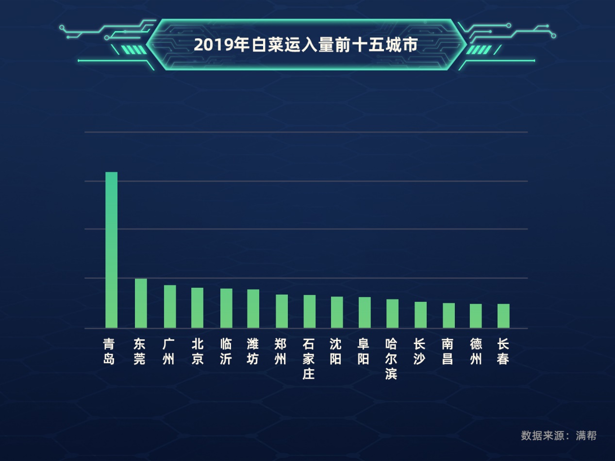 白菜單價低,以就近供給為主,張家口的白菜主要去了山東青島、濰坊等蔬菜加工及批發基地,長春白菜去了青島和沈陽,山東泰安白菜則去了石家莊和德州。北京是濰坊大白菜最大消耗城市,約5.3%濰坊大白菜供應了北京。東莞、廣州等南方城市,則以武漢、咸寧、岳陽等中部供應地為主。