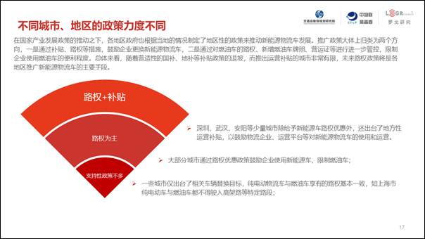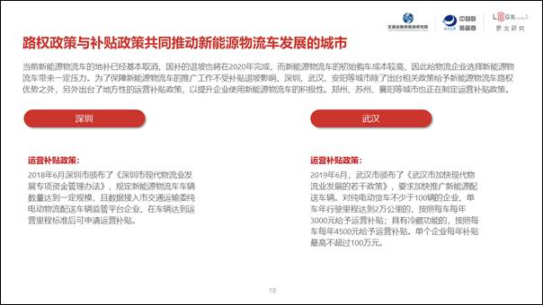 在我們調研的城市中,新能源物流車推廣應用較好的地區,幾乎都是給予了新能源物流車良好政策的城市,尤其如深圳、成都、西安等地區。從政策類型上看,主要以路權和運營補貼兩種模式為主。不同地區采取了不同的政策組合,深圳等地區在充分給予新能源物流車路權的情況下,制定了運營補貼政策,提升企業用車積極性;其余大部分地區則主要以更加開放的路權來吸引企業應用。而北京、上海等城市,由于其城市的特殊性,在沒有太多優惠政策的情況下,新能源物流車也取得了良好的發展。
