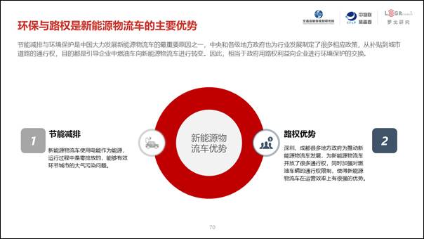 受益于前期國家和各地政府的優惠政策以及自身產品特點,新能源物流車的應用能夠帶來路權、環保、管理便捷程度、數據采集顆粒度等諸多優勢。
