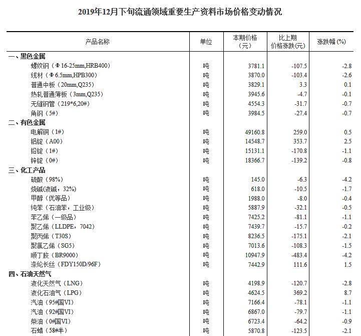 據對24個省(區、市)流通領域9大類50種重要生產資料市場價格的監測顯示,2019年12月下旬與12月中旬相比,10種產品價格上漲,26種下降,14種持平。