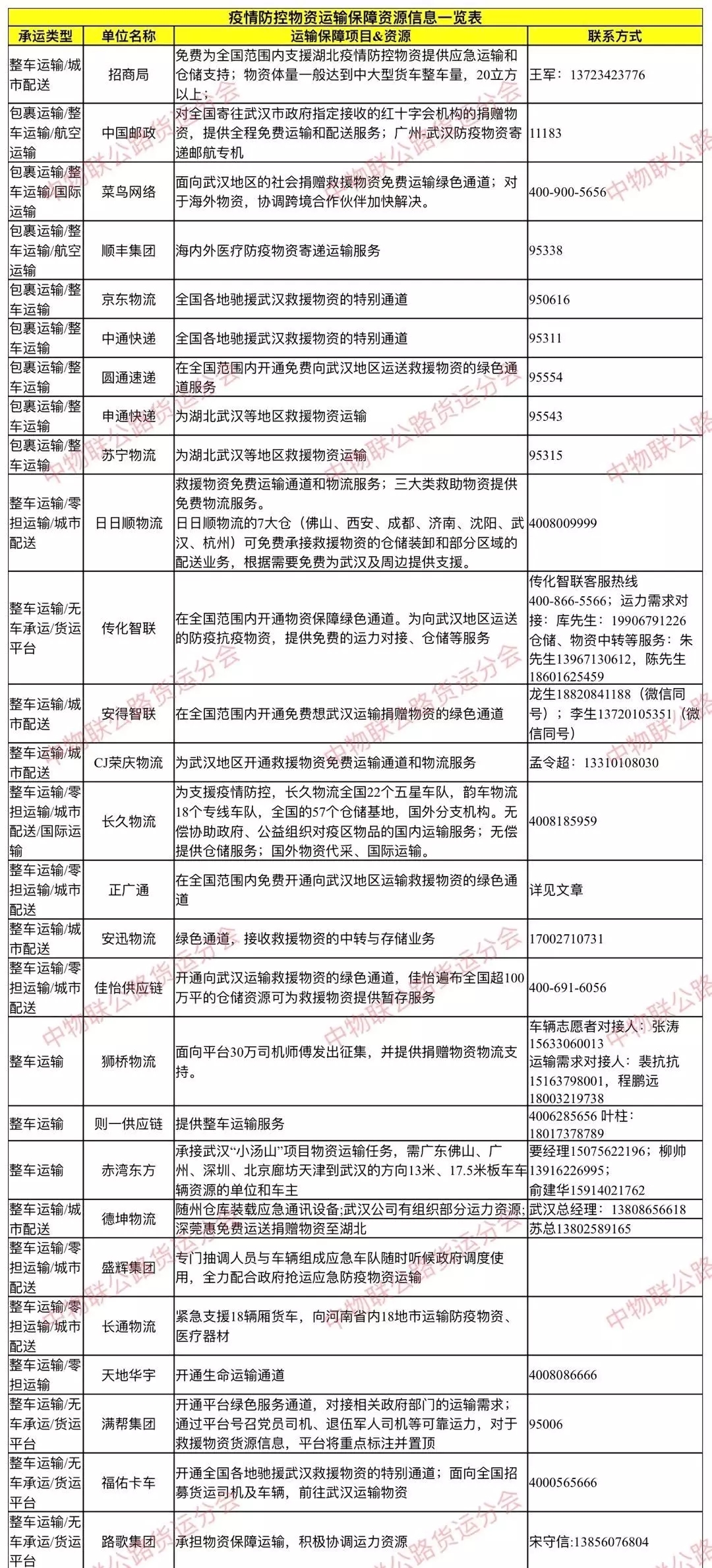 一方有難、八方支援,湖北武漢疫情牽動著廣大貨運物流人的心。目前,已經有50多家星級車隊和貨運物流企業正式提供疫情防控物資運輸保障服務,為疫情防控物資提供免費運輸和物流業務。為加強供需信息對接、團結形成合力,中物聯公路貨運分會特整理匯總了“疫情防控物資運輸保障資源信息一覽表”,請有相關運輸需求的單位和企業撥打專項聯系電話,具體對接運輸保障事宜。