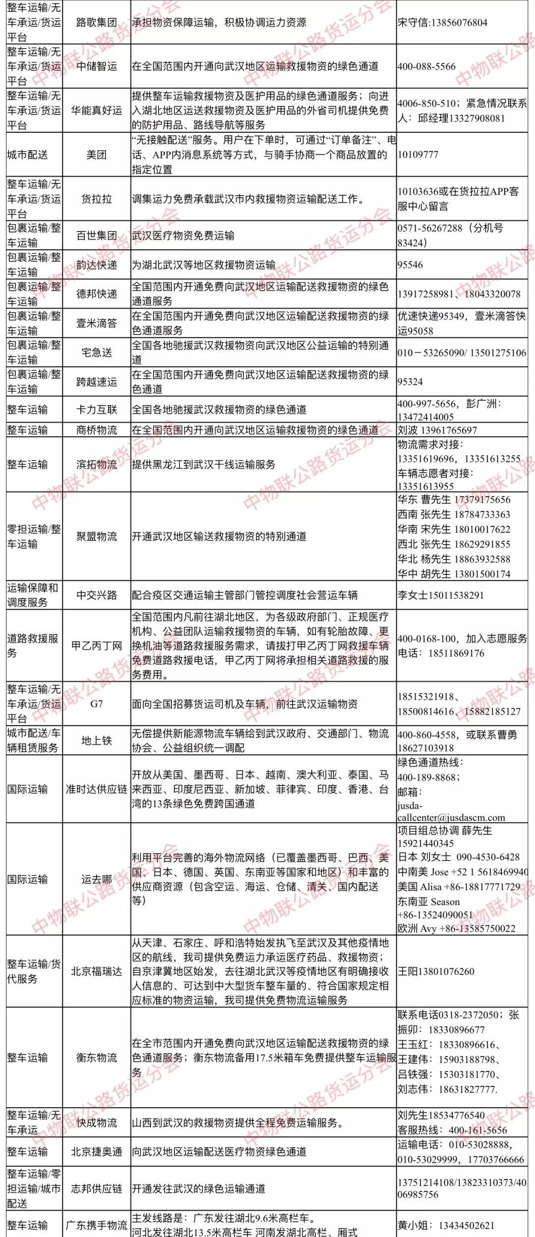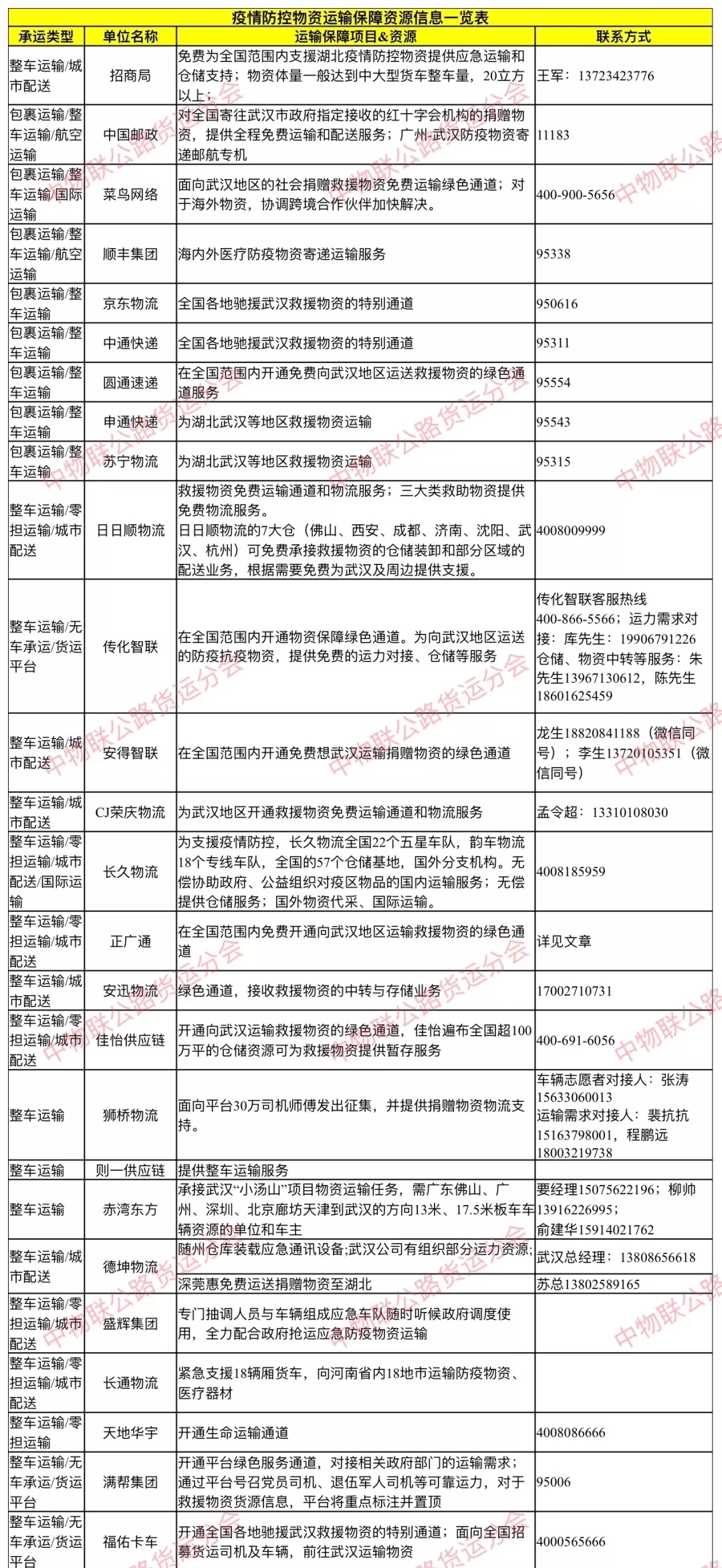 一方有難、八方支援,湖北武漢疫情牽動著廣大貨運物流人的心。目前,已經有50多家星級車隊和貨運物流企業正式提供疫情防控物資運輸保障服務,為疫情防控物資提供免費運輸和物流業務。為加強供需信息對接、團結形成合力,中物聯公路貨運分會特整理匯總了“疫情防控物資運輸保障資源信息一覽表”,請有相關運輸需求的單位和企業撥打專項聯系電話,具體對接運輸保障事宜。