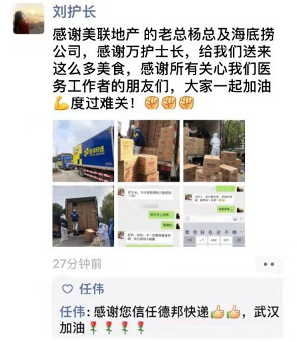 1月28日,德邦快遞協助海底撈運輸捐贈物至金銀潭醫院。當物資送達后,醫院簽收的護士長見我司司機雖戴好口罩穿好了防護服,但考慮到司機經常進出各個醫院進行派送和卸貨,于是專門為派送的司機們準備了10個口罩和1瓶洗手液,希望司機們能平安派送,并把更多的希望和安全送達到各個醫院。