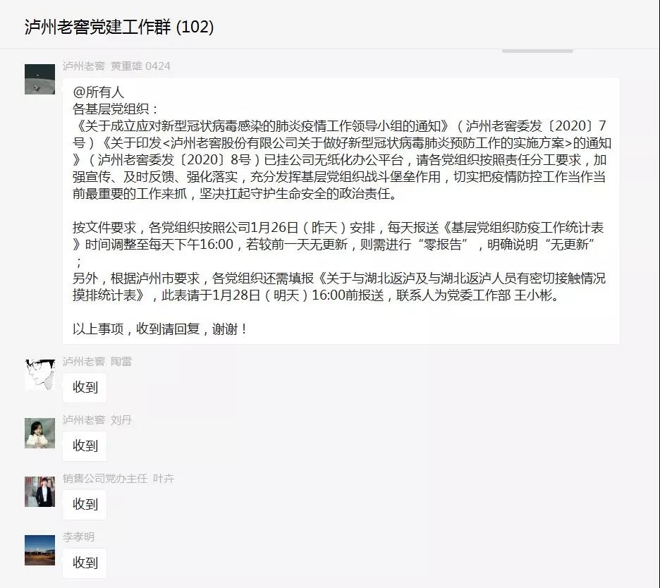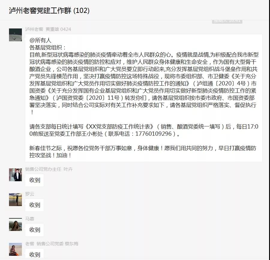 “坐在家里還能接到總公司的電話,詢問(wèn)身體及家人情況,是否需要公司給予物資上的幫助。感謝公司!本人堅(jiān)決按照公司指示,不亂跑,不串門(mén)。”特曲公司鄂東客服經(jīng)理張東波在朋友圈曬出了自己接到的公司慰問(wèn)電話。特曲公司鄂西客服經(jīng)理畢云則表示:“心里暖暖的,年初二公司領(lǐng)導(dǎo)還在為我們籌措物資,關(guān)心員工健康情況。我為自己是一名瀘州老窖國(guó)窖人而自豪,激動(dòng)。”